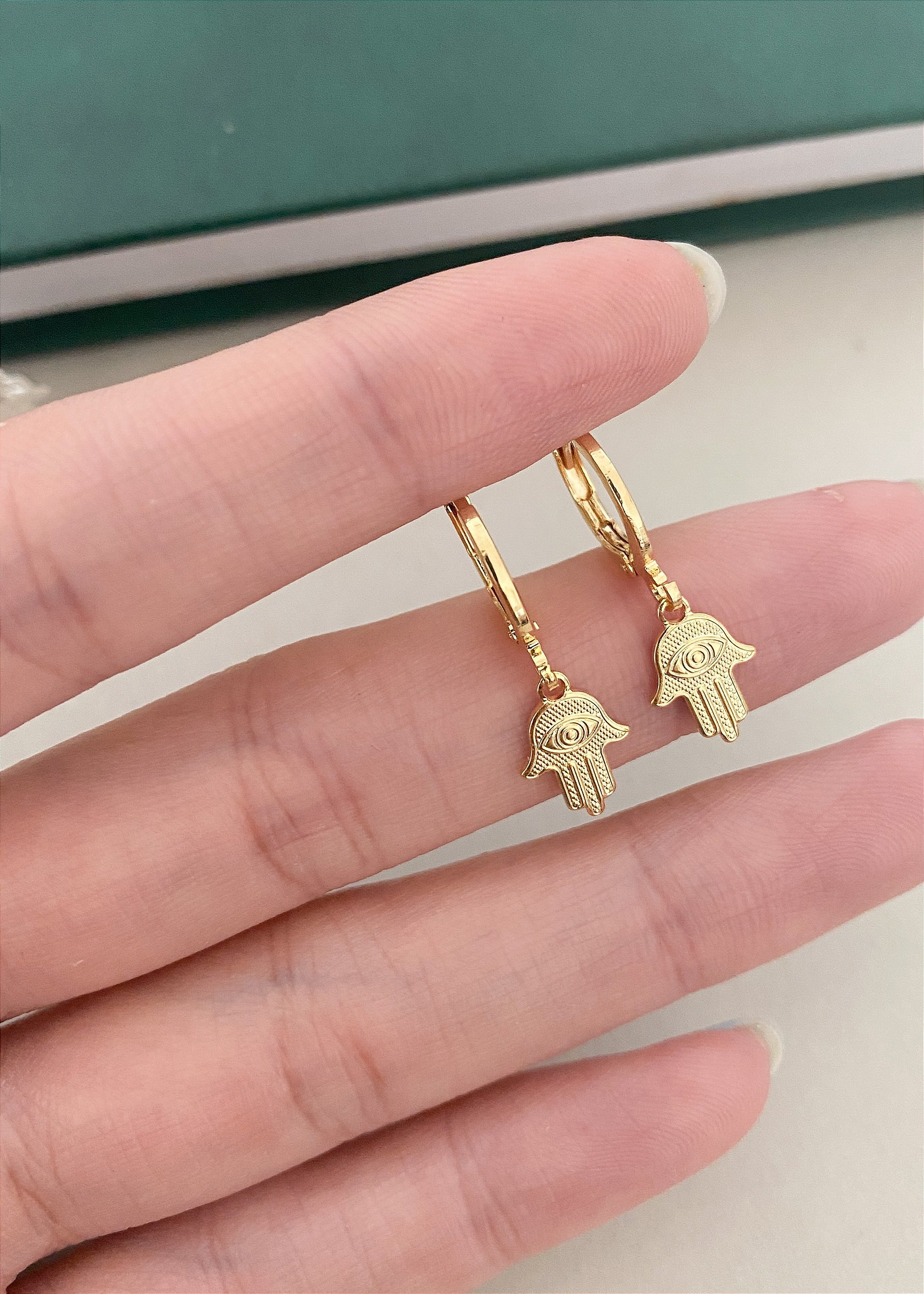 Par de argolas mini com fechamento em click e pingentes de mão de fátima.